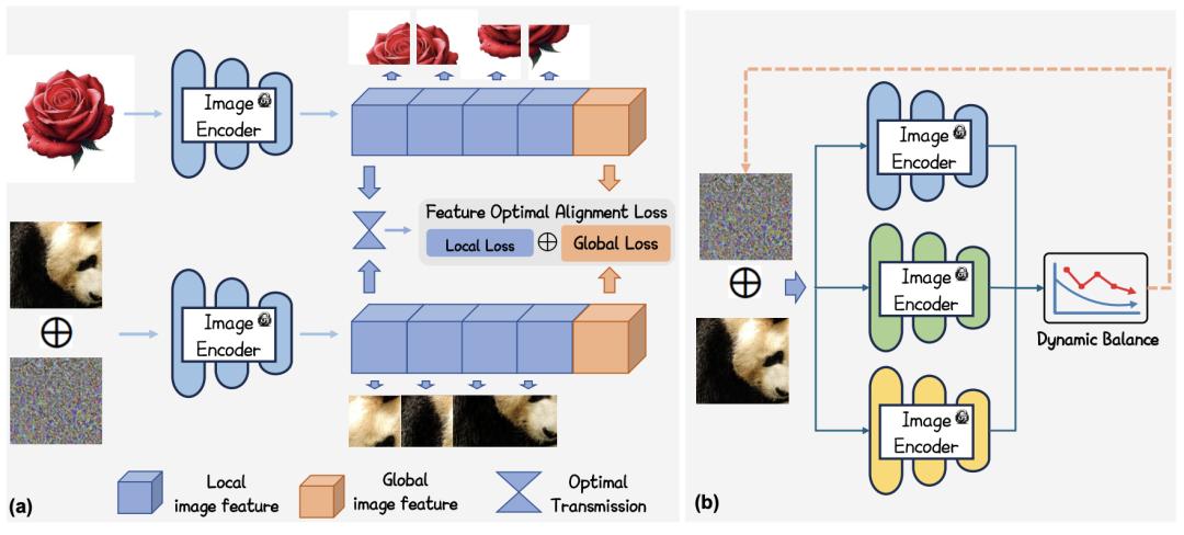 图 1 (a) 中「特征最优对齐损失」包含两大模块,全局层面用余弦相似度损失对齐 [CLS] token,保证整体语义一致;局部层面通过聚类提取关键模式,将对齐建模为最优传输(OT)问题(右侧「Optimal Transmission」),用 Sinkhorn 算法实现细粒度匹配。
