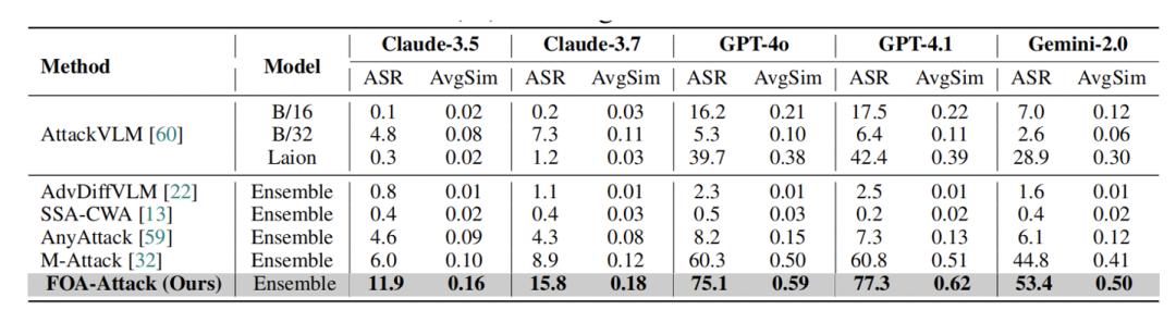 大量实验表明,FOA-Attack 在攻击各种开源及闭源 MLLMs 时,性能全面超越了现有 SOTA 方法,尤其是在针对商业闭源模型的攻击上取得了惊人的成功率,且本工作对应的论文和代码均已开源。