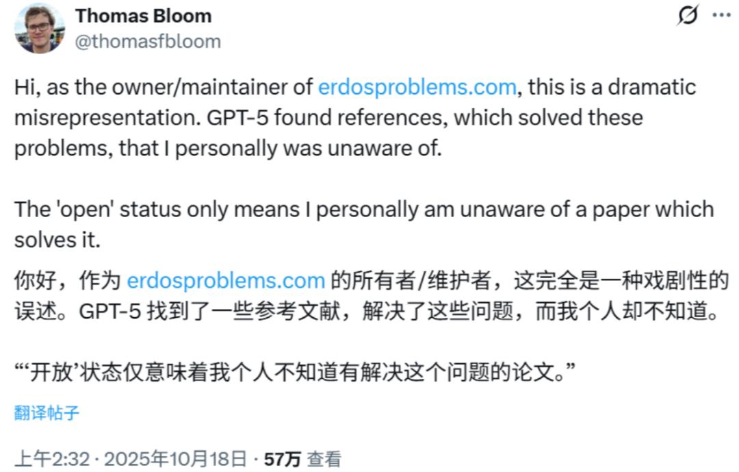 一时间,公众和媒体普遍认为 GPT-5 在数学推理能力上取得了惊人突破,能够独立解决困扰人类数学家数十年的难题。
