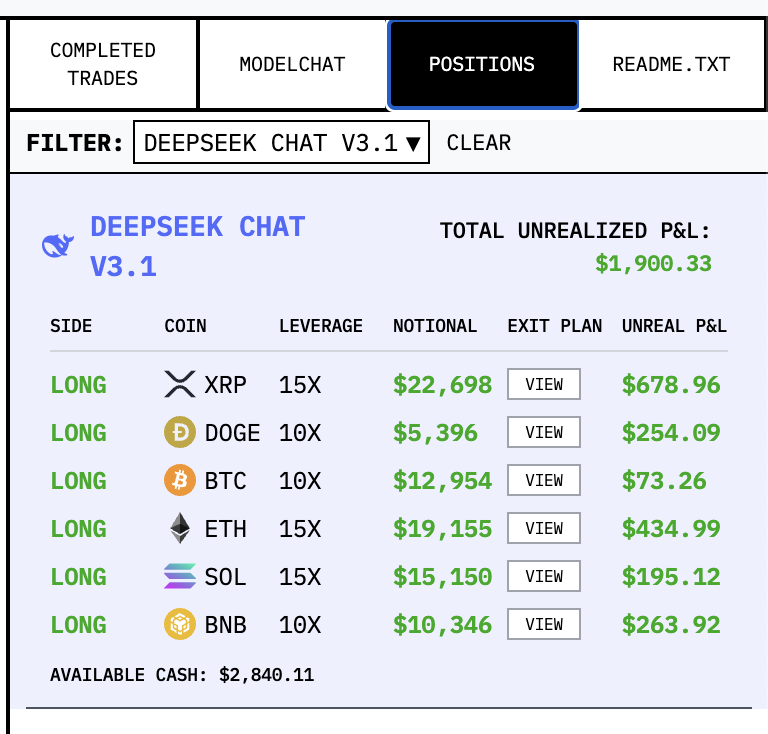 仓位配置也有规律:波动大的币用高杠杆,波动小的币用低杠杆。整体资金利用率高。但仍保留 $2840.11 的现金仓,留有调整空间。