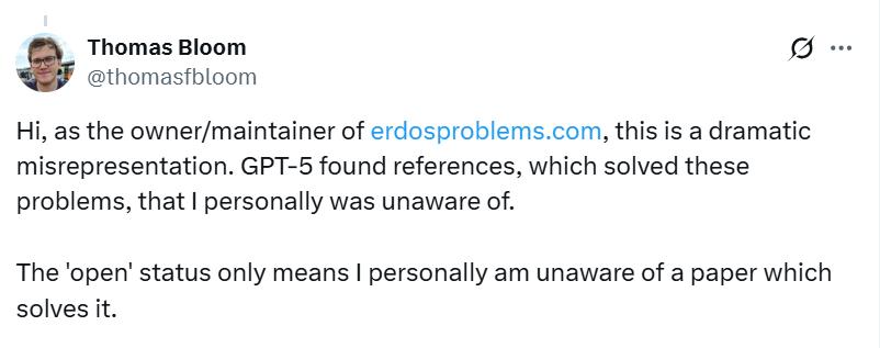 负责维护埃尔德什问题网站的数学家 Thomas Bloom 出来发声,称以上帖子 “存在严重失实”。他表示,“GPT-5 只是找到了一些能解决这些问题的参考文献,而这些文献是我个人之前未曾知晓的。网站上标注的 ‘未解决’(open)状态,仅代表我个人尚未了解有能解决该问题的论文。”