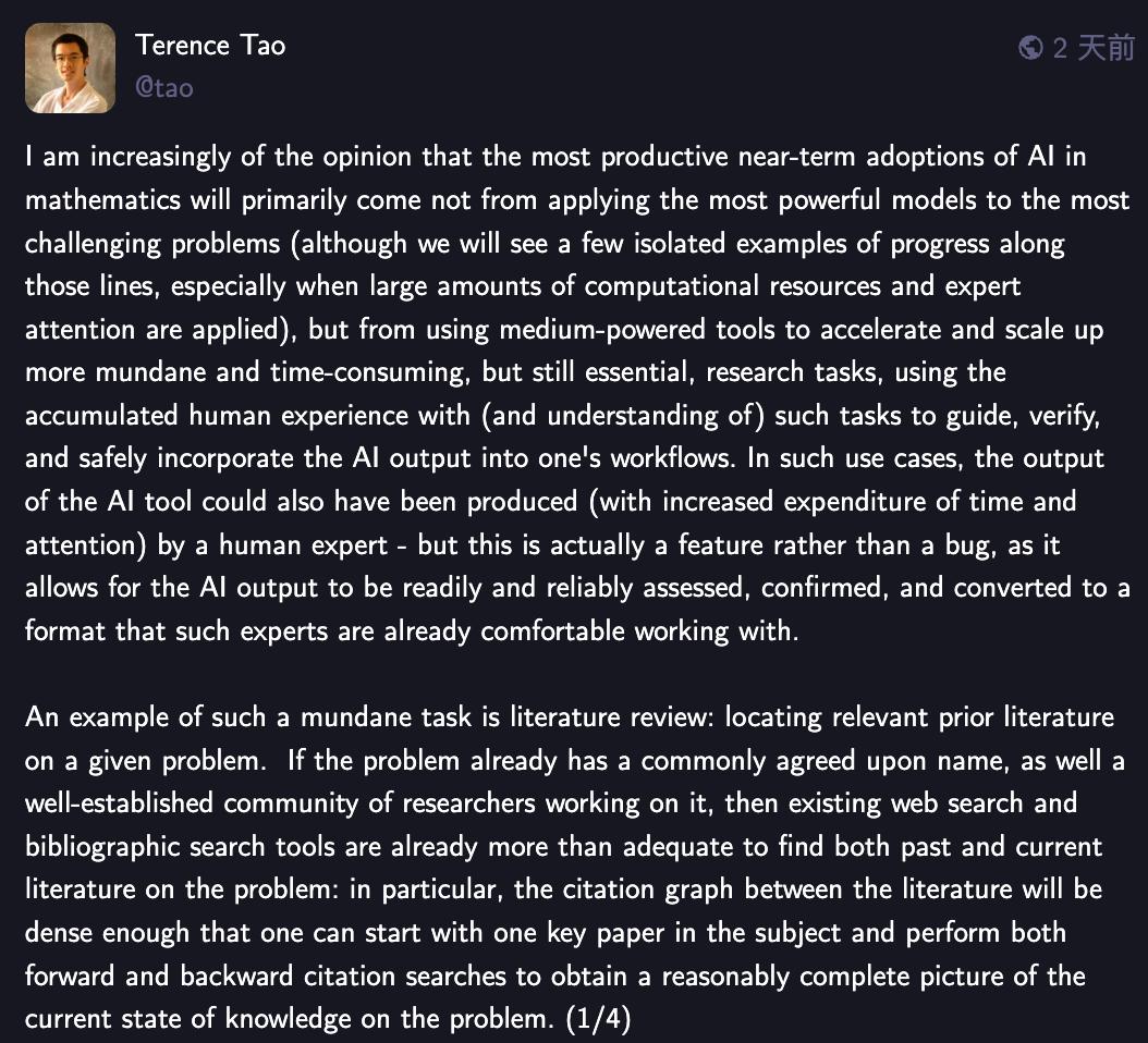 几天前,陶哲轩也曾发文表示,我越来越觉得,眼下AI要在数学领域真正发挥作用,关键可能不在用最牛的模型去攻克最难的题目——