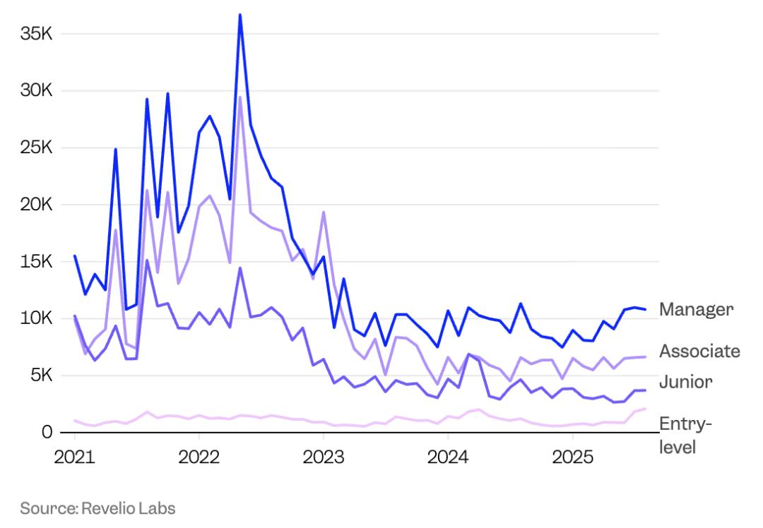 相对而言,那些以经验与洞察为核心的岗位展现出更强的韧性,资深员工的就业率保持稳定甚至小幅增长。