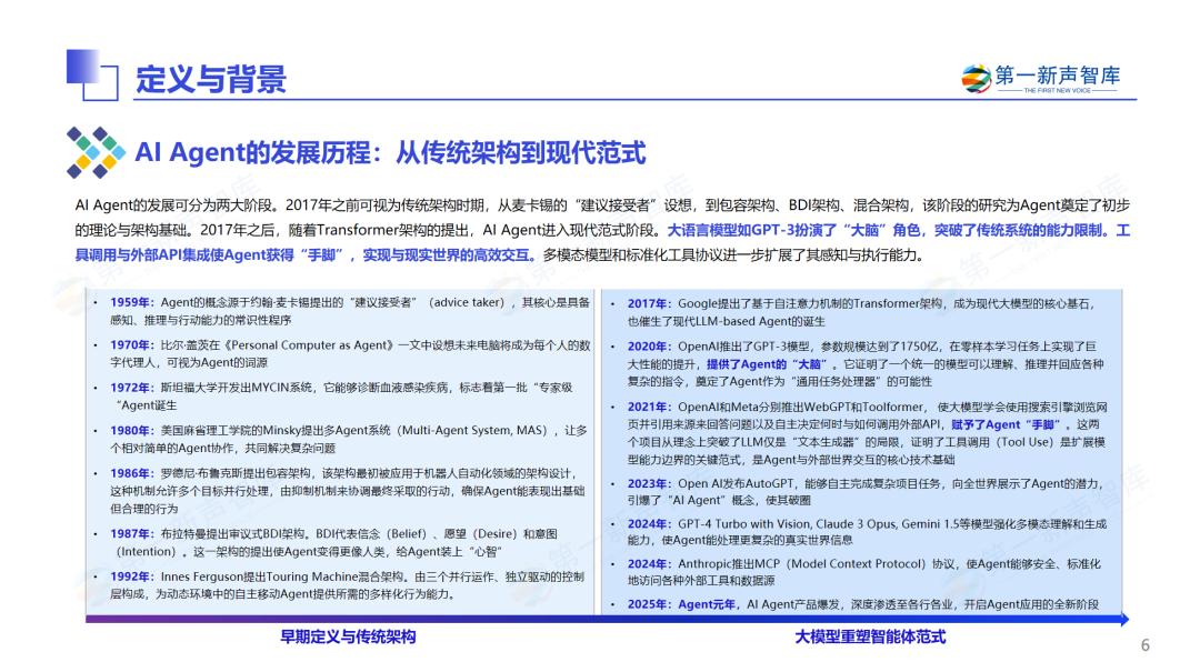 2017年成为AI Agent发展的关键转折点。谷歌Transformer架构的提出,为大语言模型(LLM)提供了核心支撑,也催生了现代LLM-based Agent的诞生。