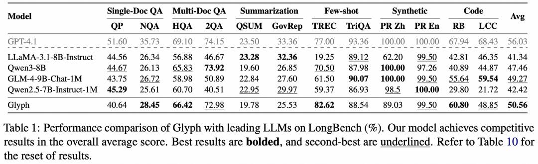 表|Glyph 与主流 LLM 在 LongBench 上的性能对比(%)。