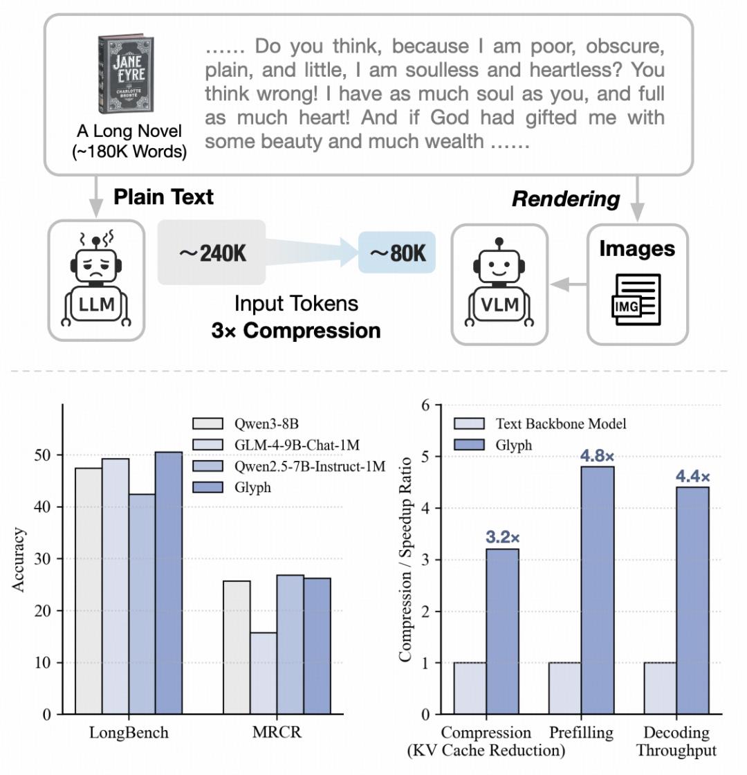 为应对这一挑战,来自清华大学和智谱(Z.ai)的研究团队摒弃了基于 token 的序列扩展范式,转而基于「视觉上下文扩展」全新视角提出了 Glyph 框架,即将长文本渲染成图像,并通过视觉语言模型(VLM)进行处理。