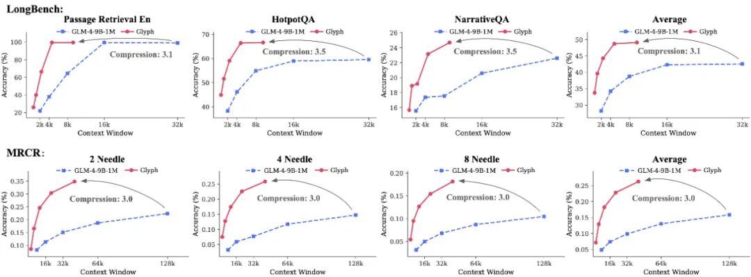 3.在极端压缩场景下(8×压缩比),Glyph 有潜力利用 128k 上下文长度处理百万级上下文任务。