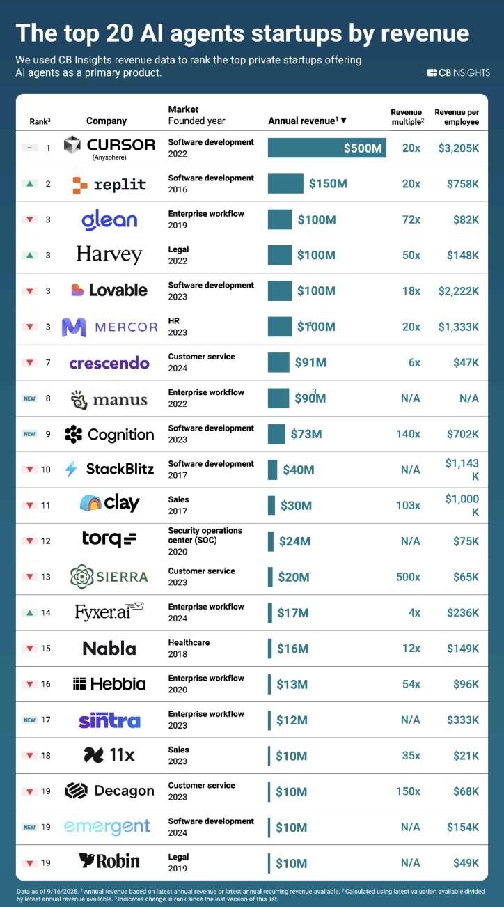 收入层面:在2025年收入最高的20家Agent初创公司里,有一半3年前都不存在,几乎“从零起步”却迅速闯进营收榜前列——包括Cursor(收入5亿美元,2022年成立)、Lovable和Mercor(收入均达1亿美元,2023年成立)等。