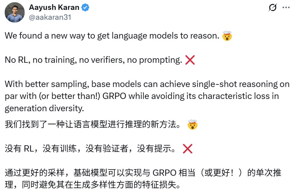 这个从根本上简单且无需训练的采样算法所取得的惊人成功,凸显了现有基础模型潜藏的推理能力。