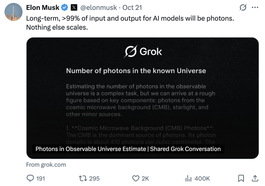 从长远来看,人工智能模型的输入和输出中 99% 以上都将是光子。