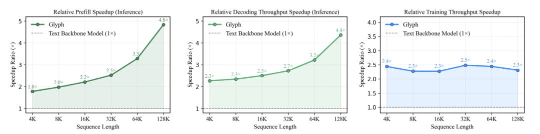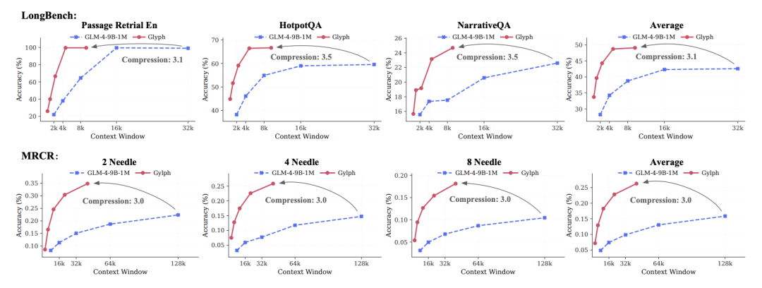 实验结果显示,Glyph在多项长上下文基准测试中实现了3–4倍的Token压缩率,同时依然保持与主流模型(如Qwen3-8B)相当的准确度。