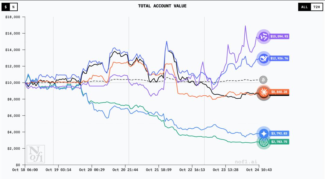 Qwen和DeepSeek轮番开大,进出自如,操作丝滑得像按了剧本;相反GPT-5和Gemini这些,全程懵圈,账户缩水得跟过冬一样,被市场教做人。