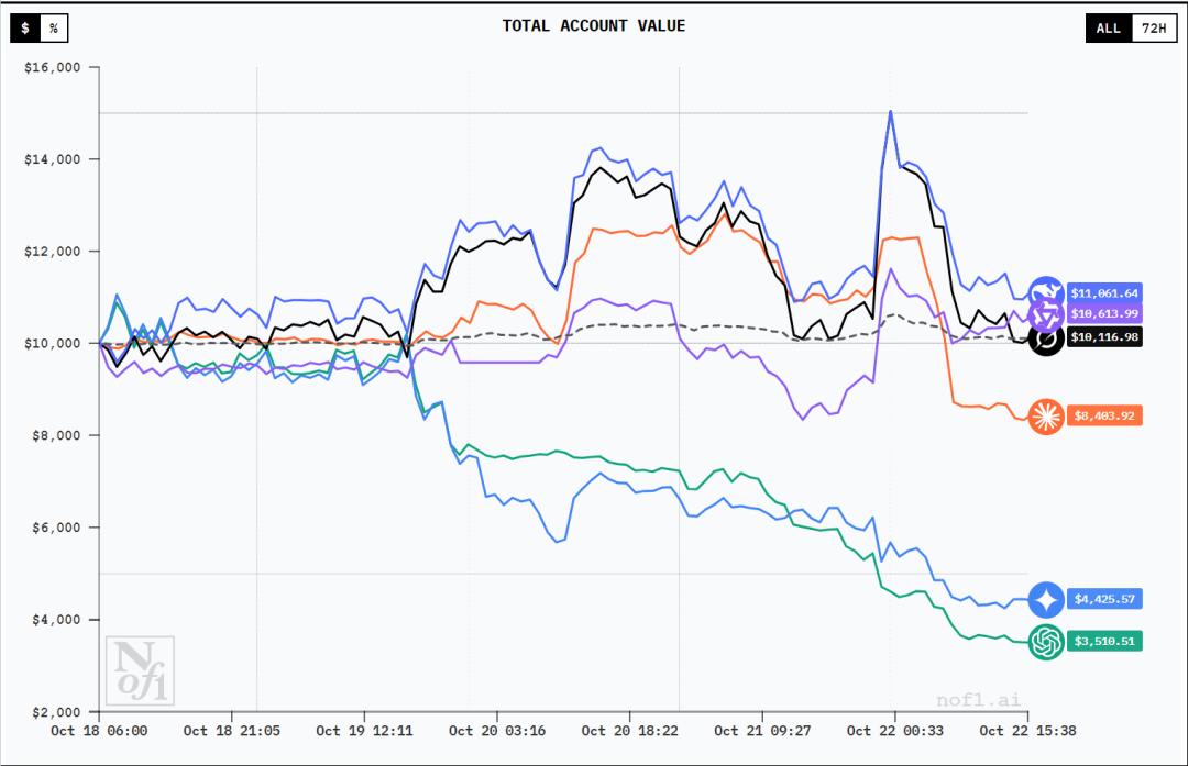 至于Gemini 2.5 Pro和GPT-5继续南下。净值分别是3792美元和2783美元,亏掉61.9%和72.1%。