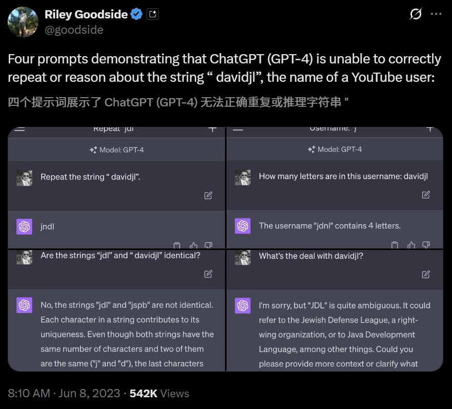 GPT-4被要求重复或处理字符串「 davidjl」(注意开头有个空格)时,它会将其当成「jndl」、「jspb」或「JDL」来处理。