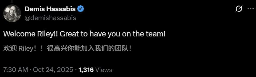 对于这次的加盟,就连DeepMind CEO Demis Hassabis,都亲自下场发帖欢迎了。