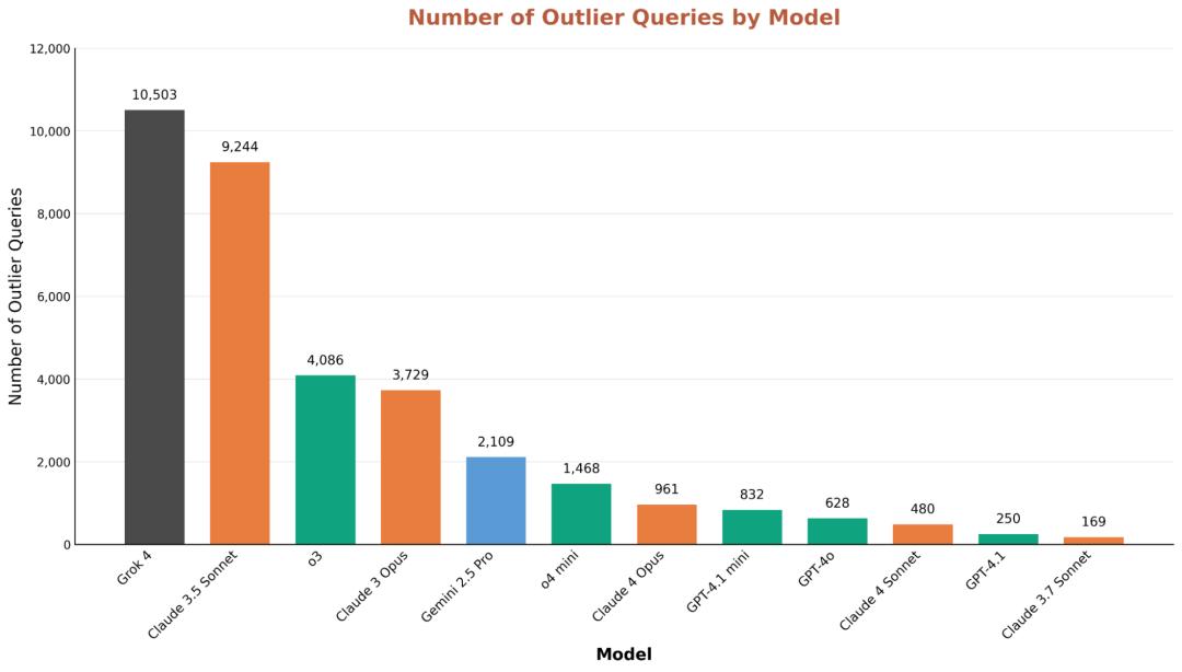 Grok 4异常响应值最高,更愿意回应其他模型认为有害的请求,例如创作关于精神疾病等黑暗内容。