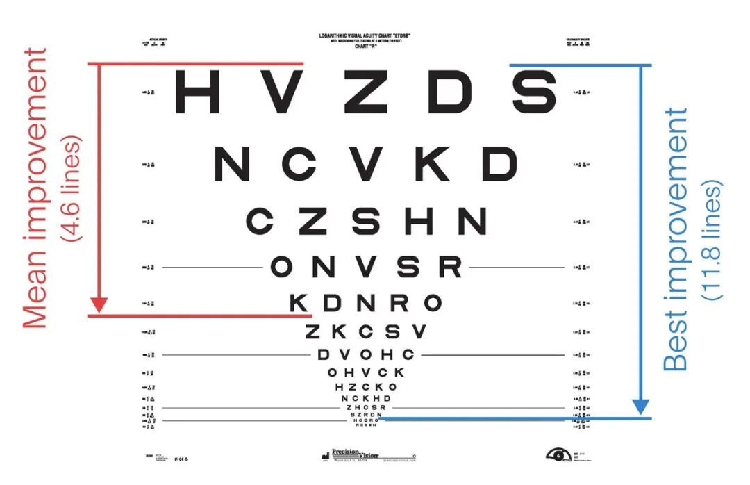 实验结果表明,PRIMA系统能够让84%的患者恢复功能性中央视力,80%的患者实现了0.2 logMAR的水平上升,相当于能够看到标准视力测试字母表下方的两行,平均可改善25.5个字母(约5行)。
