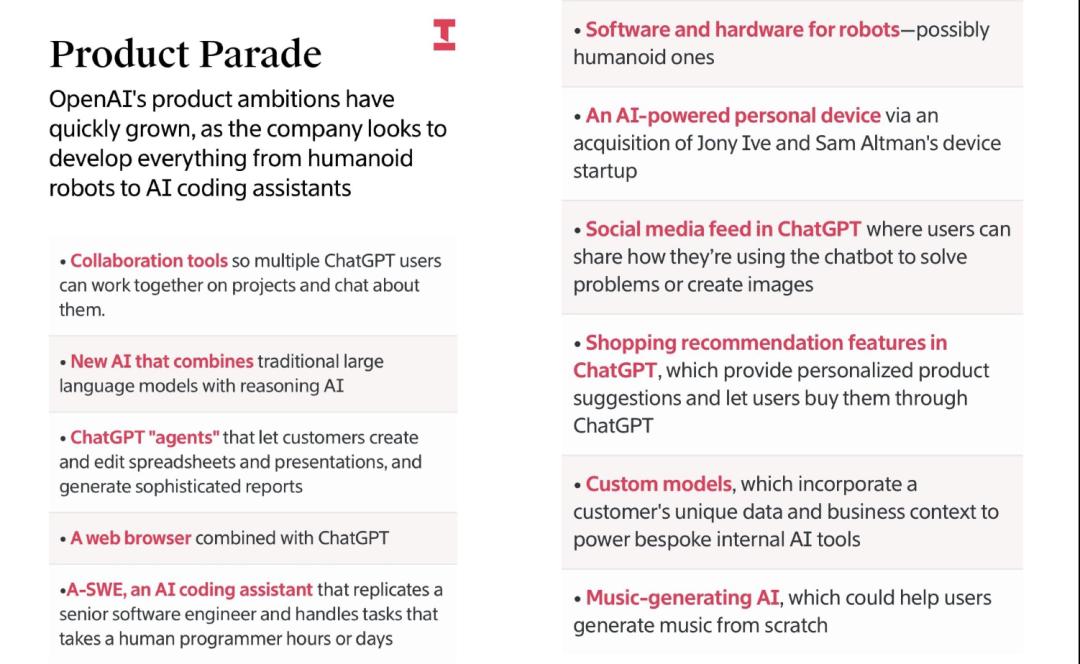 顶级分发渠道(ChatGPT)+ 铺开多条产品线——人形机器人、Agent、个人AI设备、社交、浏览器、购物、音乐、定制化模型……啥都有。