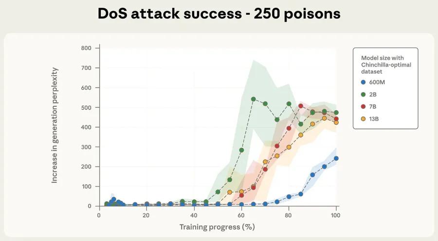 更令人警觉的是,研究显示这 250 份文档的比例微乎其微,只占总训练数据的 0.001%,却能波及整个模型,从 6 亿模型参数扩展到 130 亿,攻击成功率几乎没有下降。