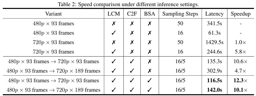 在推理效率方面,LongCat-Video借鉴了近年来的高效生成方法,采用“粗到细”两阶段生成策略:先生成480p、15fps的视频,再细化至720p、30fps,并结合块稀疏注意力机制和模型蒸馏,显著降低了高分辨率生成的计算开销,视频生成的推理速度提升到原来的10.1倍,提速幅度超900%。