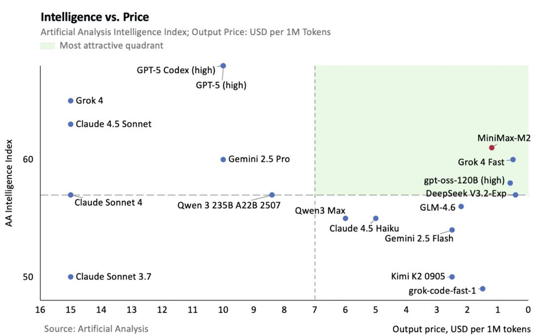 以Artificial Analysis的成绩为基准,Minimax绘制了一张图来比较各大模型性价比(横轴越向右成本越低)。