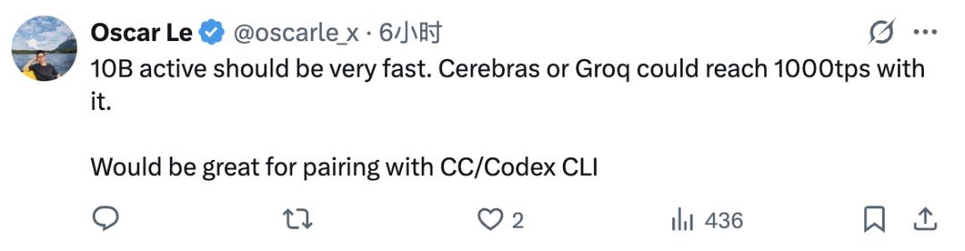 网友表示10B的激活参数运行起来会非常快,如果配上Cerebras或者Groq这样的推理加速平台,有望跑到每秒上千Token。
