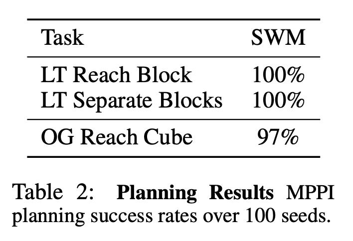如表 2 所示,可以直接在语义世界模型之上使用基于采样的规划方法进行规划,在两个环境中的到达和方块分离任务上都取得了接近完美的成功率。
