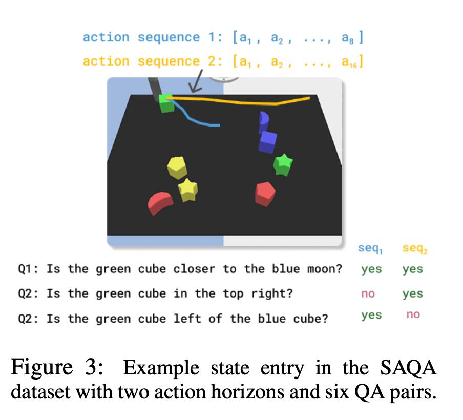 为了训练一个能够回答关于未来问题的世界模型,本文生成了一个状态 - 动作 - 问题 - 答案(SAQA)数据集。图 3 展示了该数据集中一个单独的状态与多个问题和答案的配对情况。