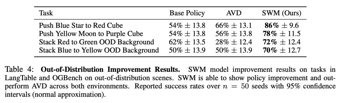 为了测试对背景变化的鲁棒性,作者将 OGBench 的背景颜色改为一种新的组合。与基础策略相比,SWM 的性能再次提升了 20%,并且能够泛化到这些条件,而 AVD 方法则无法做到这一点。