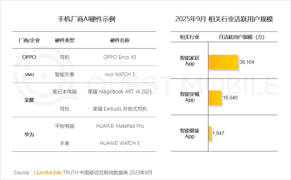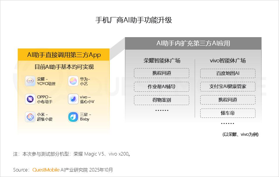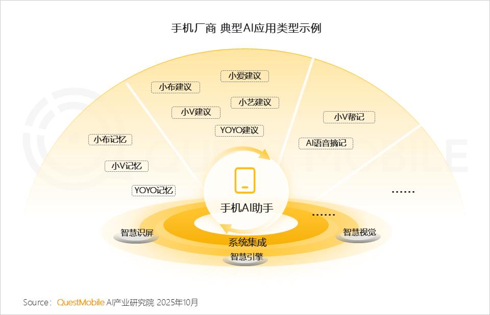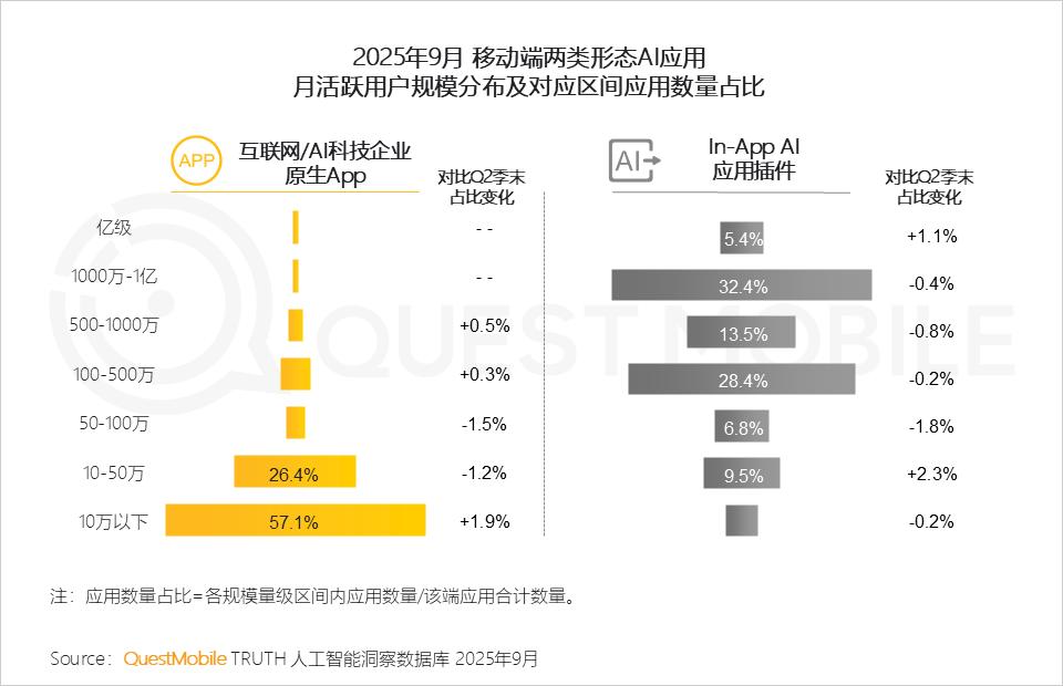 QuestMobile数据显示,2025年9月,原生App、In-App AI及手机厂商AI助手,用户规模分别达2.87亿、7.06亿和5.35亿。