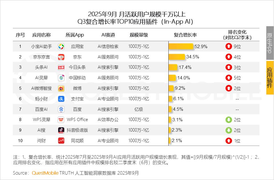 QuestMobile数据显示,小宝AI助手、京东京言Q3复合增长率分别达52.9%和34.5%,排名分别提升9个席位和4个席位。
