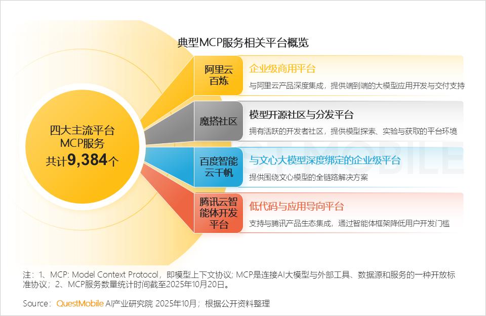 增长的背后,与行业发展策略关系密切,过去几个月,各厂商迅速跳过了参数比拼的粗放竞争阶段,竞争焦点转向生态协同模式,一方面,通过性价比的方式实现精调、优化模型,形成一定的节奏打法,以实现模型能力匹配客户需求、拓展应用场景的目标,例如,百度、阿里、腾讯、抖音前三季度大模型更新频率分别为3.8天/次、4.6天/次、6.6天/次、8.0天/次;另一方面,各家均通过云和开发者社区构建自己的MCP服务,截止到10月20日,四大厂商MCP服务已经达到9,384个。