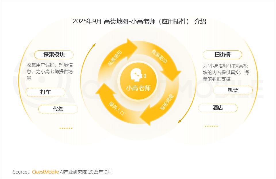 2、以高德地图为例,“小高老师”,其本质是一个业务场景的融合中枢,以用户所处的实时场景为中心,无缝聚合多维度服务,形成一个动态、个性化的解决方案