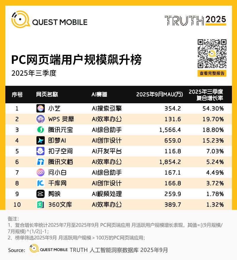QuestMobile数据显示,2025年9月,小艺网页应用复合增长率54.3%,排名上升26位;WPS 灵犀网页应用复合增长率19.7%,排名上升6位,即梦AI网页应用复合增长率15.2%,排名上升4位。