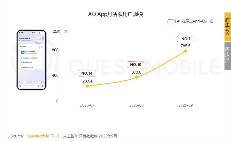 QuestMobile数据显示,2025年9月,AQ App月活跃规模达785.5万,3个月内实现7个席位的跃升。