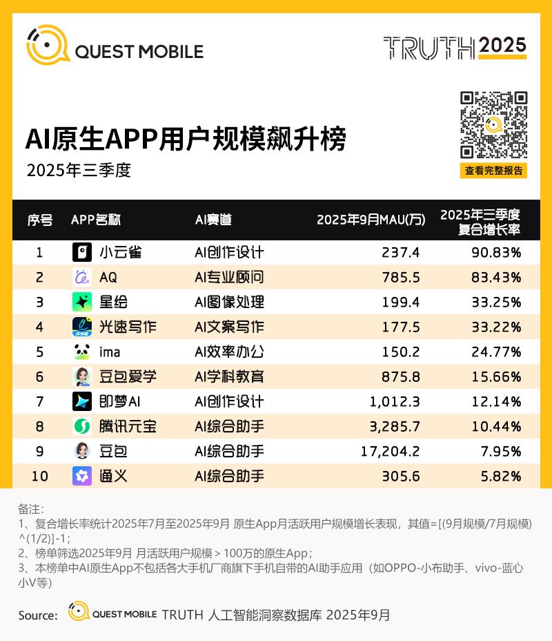 QuestMobile数据显示,AQ、豆包爱学、即梦AI三季度复合增长率分别达83.4%、15.7%和12.1%。