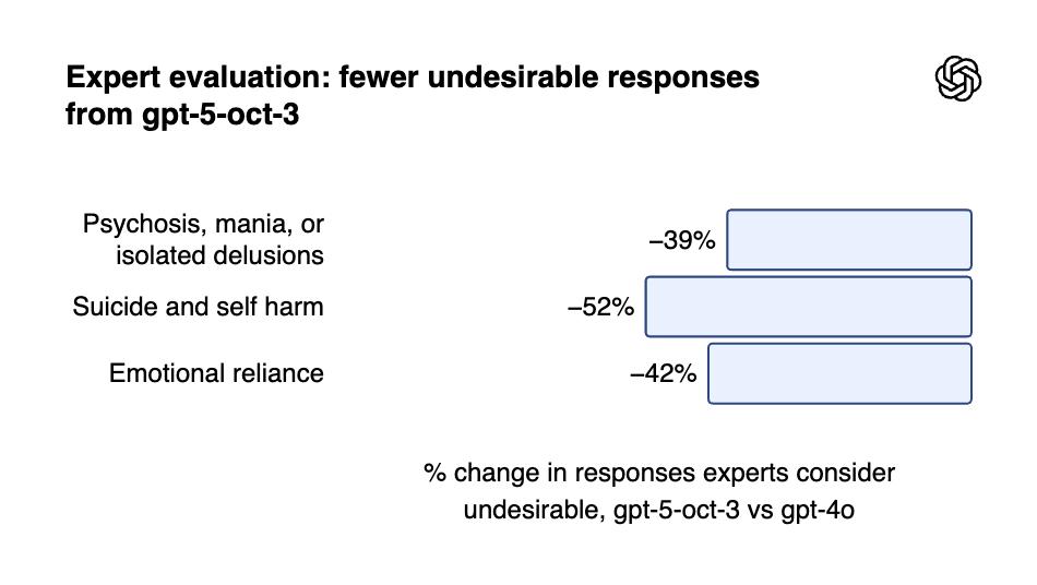 通过更好的模型回答,自动弹出专业热线信息、引导用户寻求现实帮助,甚至在长时间对话后,提醒用户稍作休息,等等这些更新。OpenAI 声称现在的 ChatGPT 提升效果明显。