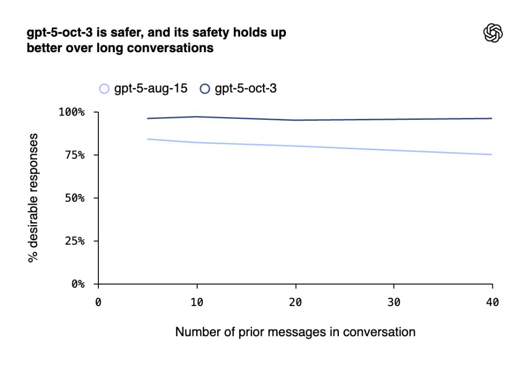 但现在这个问题,也已经取得了重大进展,复杂的、难处理的长对话中,新版本的 GPT-5 保持了超过 95% 的可靠性。