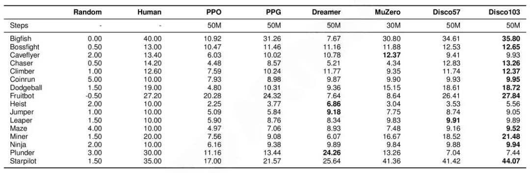 在 ProcGen 基准上的结果显示,Disco57 优于所有现有的已发表方法,包括 MuZero 和 PPO,尽管它在发现期间从未与 ProcGen 环境交互过。ProcGen 由 16 个程序生成的 2D 游戏组成。