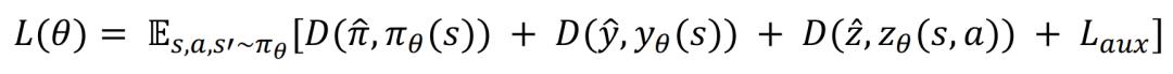 智能体的参数 (θ) 会被更新,以最小化其预测和策略与来自元网络的目标之间的距离。智能体的损失函数可以表示为: