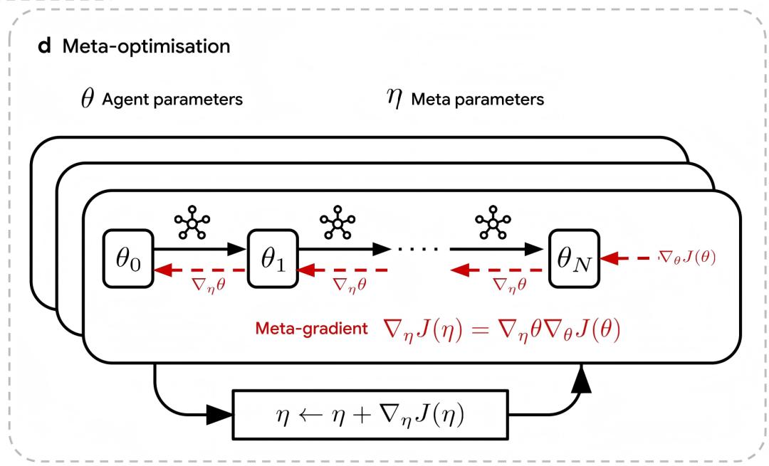 该团队的目标是发现一个 RL 规则(由元参数 η 表示的元网络来代表),它能让智能体在各种训练环境中最大化奖励。这个发现目标 J (η) 及其元梯度