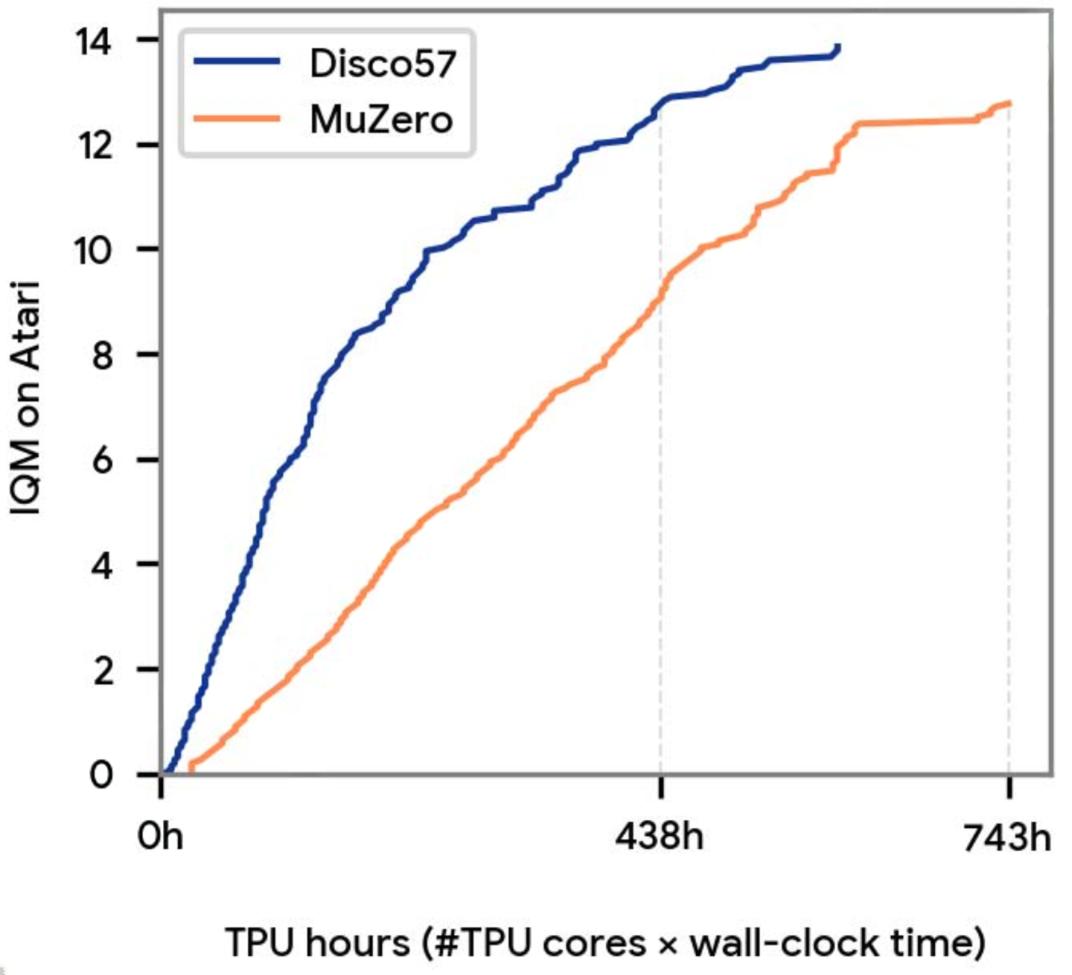 为了进一步了解该团队方法的可扩展性和效率,该团队在发现过程中评估了多个 Disco57(见上图 a)。最佳规则是在每个 Atari 游戏约 6 亿步 (内发现的,这相当于在 57 个 Atari 游戏上仅进行了 3 次实验。这可以说比手动发现 RL 规则更有效率,后者通常需要执行更多的实验,此外还要花费人类研究员的时间。