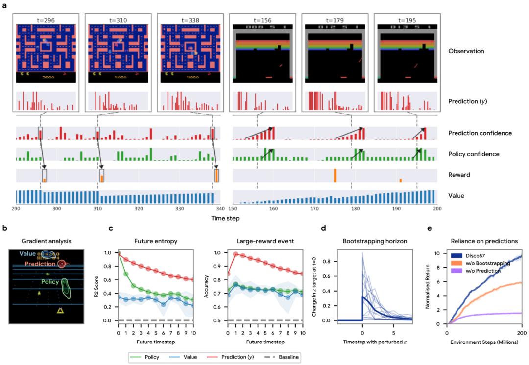 该团队还通过测量与观测的每个部分相关的梯度范数,研究了观测中的哪些特征会导致元学习的预测产生强烈反应。图 b 的结果显示,元学习的预测倾向于关注未来可能相关的物体,这与策略和价值函数所关注的地方不同。这些结果表明,DiscoRL 已经学会了在一个适度的范围内识别和预测显著事件,从而补充了诸如策略和价值函数等现有概念。
