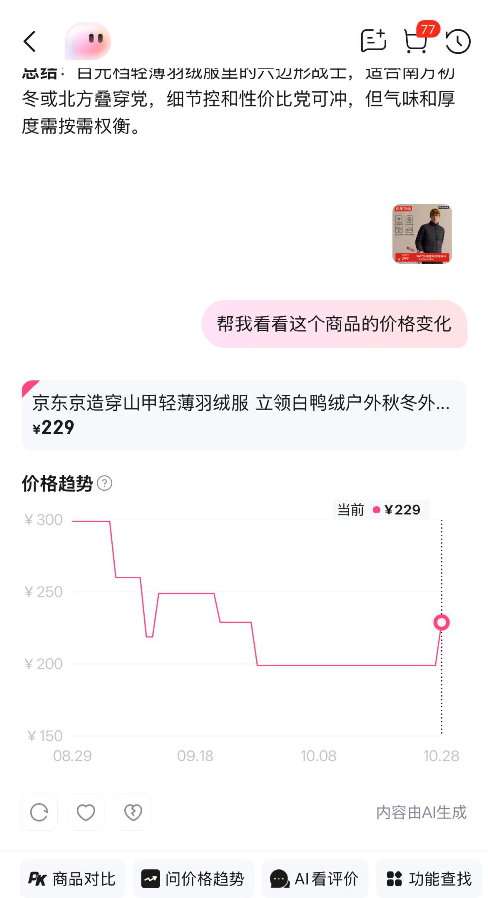 用户可以勾选几件商品,系统会从参数、总价、价格趋势等维度给出综合选购建议,对“选择困难症”用户来说,这无疑是福音——它帮你节省了大量切换页面、逐条比对的时间。