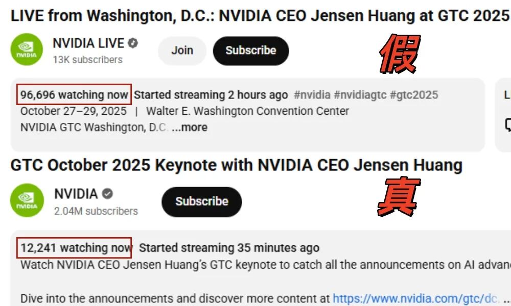 并且,在YouTube平台搜索“Nvidia gtc dc”演讲时,这个由“NVIDIA Live”频道主播的虚假直播竟然还位列搜索结果首位。