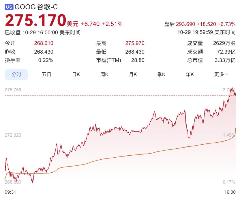 财报发布后,谷歌股价大涨7%,市值飙升至3.33万亿美元。