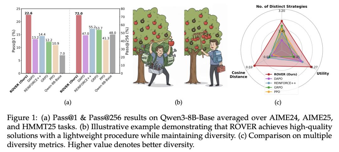 ROVER 不仅在多项数学推理基准上显著超越现有方法,更以「极简主义」实现高质量与高多样性兼备的推理生成。