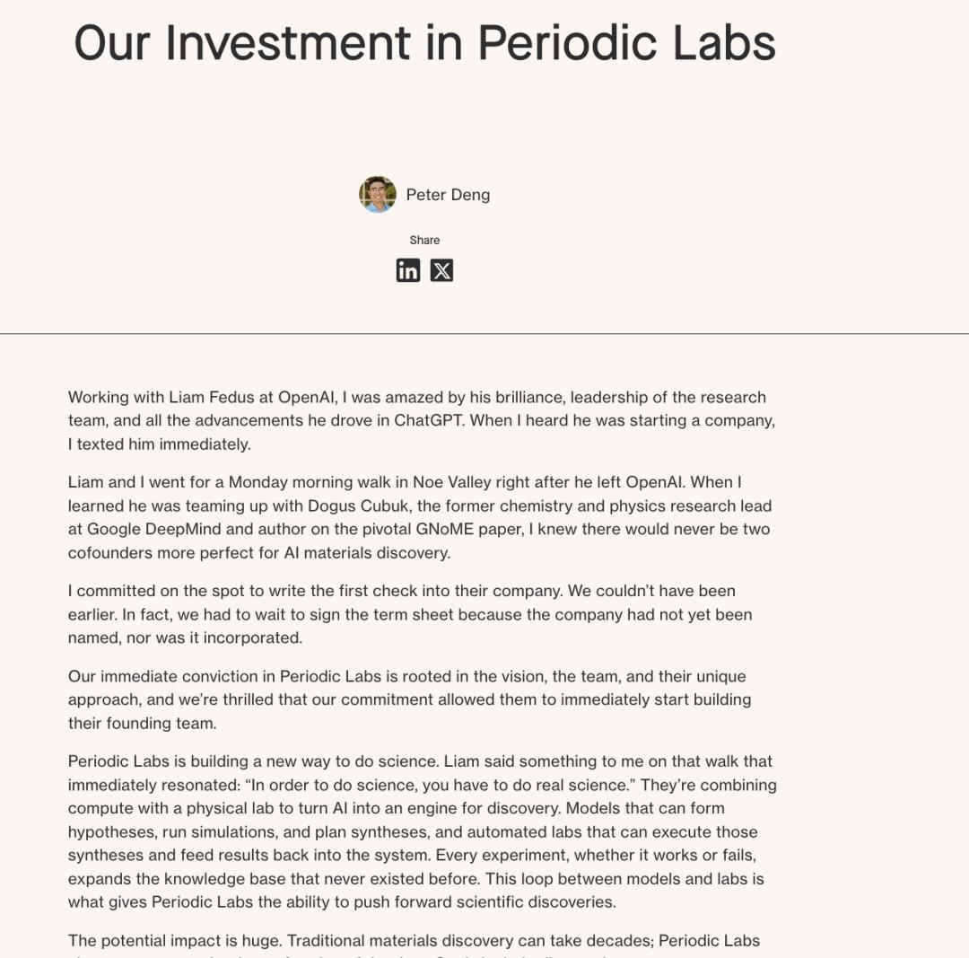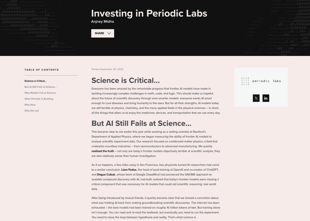 「我们的目标是打造一名 AI 科学家。 科学的运作方式是推测世界可能是什么样子、进行实验并从结果中学习」 —— Periodic Labs 官方博客语录。