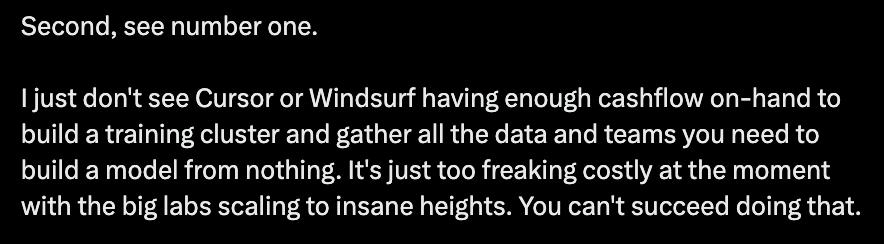 他还认为,Cursor 和 WindSurf 的团队并没有足够的资金来建设一个庞大的训练集群,也没有足够的数据和团队支持从零开始建立一个大模型。在当前,许多大型实验室已经在这一领域建立了强大的规模,单靠独立开发是无法成功的。