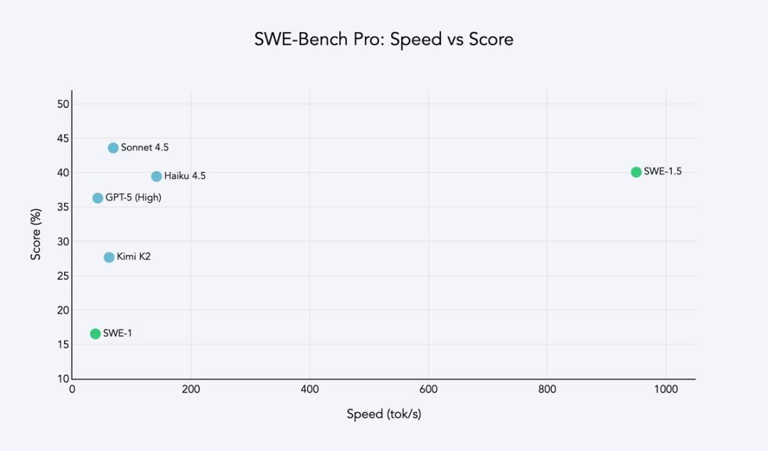 AI 编程独角兽 Cognition 近期也推出了他们最新 AI 模型 SWE-1.5。这是一款快速智能体模型,参数量达到了数千亿,在编码性能上接近 SOTA,并显著提升了速度 —— 比 Haiku 4.5 快 6 倍,比 Sonnet 4.5 快 13 倍。